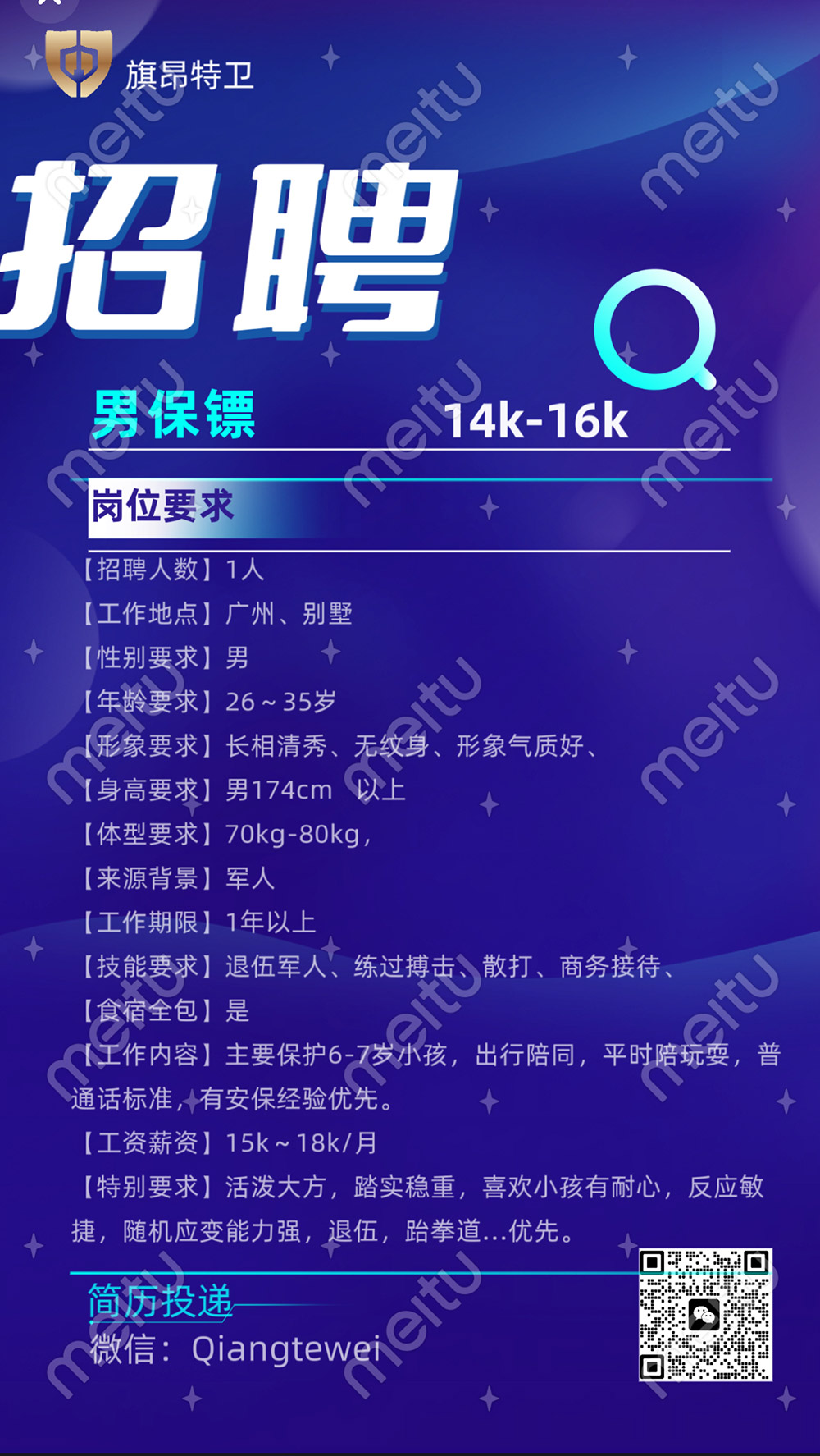 旗昂特卫招聘男保镖1人